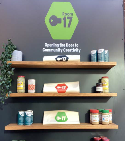 Room 17 logo and brand activitation has been co-designed with school children, final year design students at Leeds Beckett University, community and staff members. The Youth Action Group develop a toolkit to get the word out, whilst Year 4 children visited the university where they used stencilling and RISO printing during workshops led by university students to create a Room 17 Exhibition.